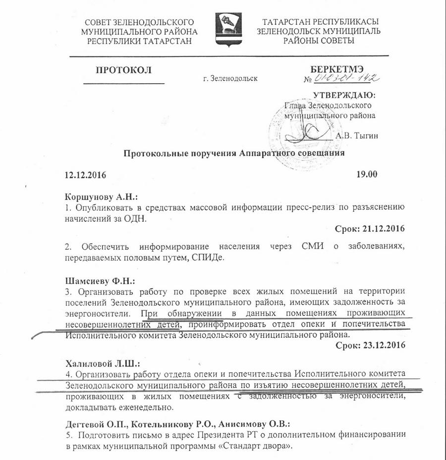 На днях соцсети взорвал документ, опубликованный Советом муниципального района Зеленодольска, что в Республике Татарстан. Глава района А.В. Тыгин письменно поручает организовать проверку всех жилых помещений, в которых есть задолженность по оплате услуг ЖКХ. Если в квартирах обнаружат детей, то органам опеки предписано изымать их из семьи. Отчитываться о результатах социальные службы обязаны еженедельно.