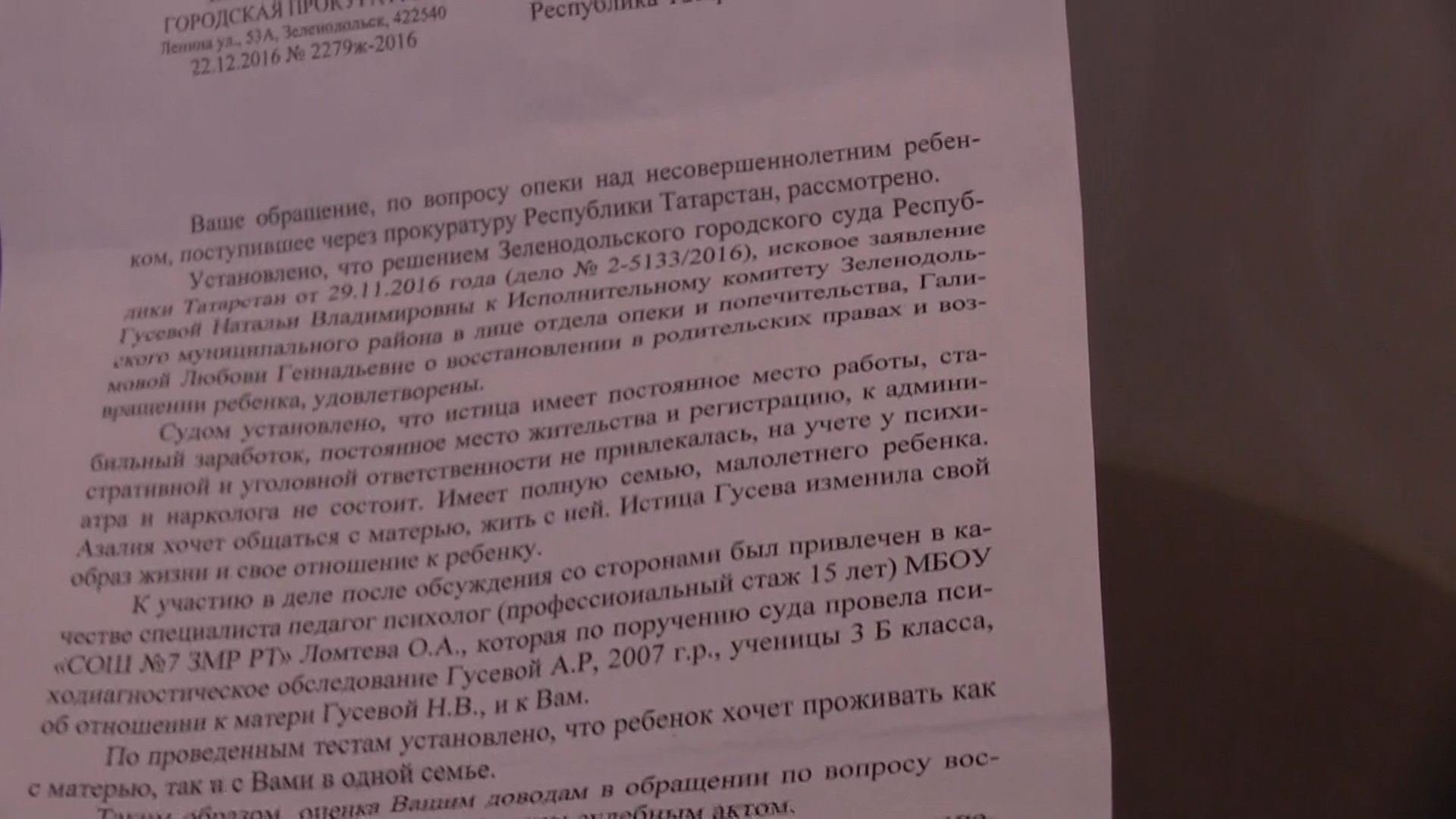 При этом, пояснила она, Азалия фактически не имеет ни одного метра на улице Солнечной. И на него не ведут никакие начисления в управляющей компании. "За все услуги я плачу в своей квартире, где у нее до 18 лет временная регистрация. Долгов у нас нет ни копейки – я все оплачиваю. Мне Миннигараева (начальник отдела опеки и попечительства Зеленодольского муниципального района – прим.ред.) сказала: платить не будете? Я говорю: нет, не буду. Я не должна платить чужие долги. Она мне вместе с сотрудниками прокуратуры сказала: если Вы платить не будете, мы Вас лишим опекунства".