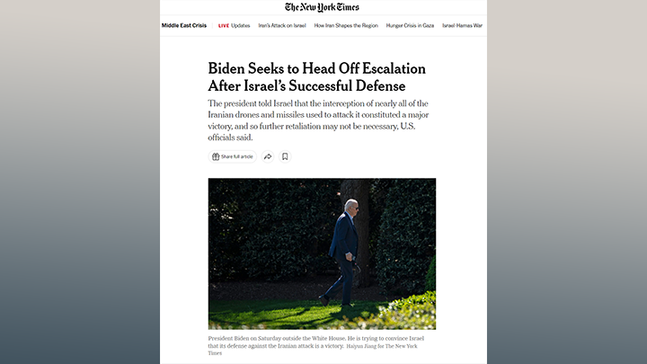 "Байден стремится предотвратить эскалацию после успешной обороны Израиля"//Скриншот страницы сайта nytimes.com