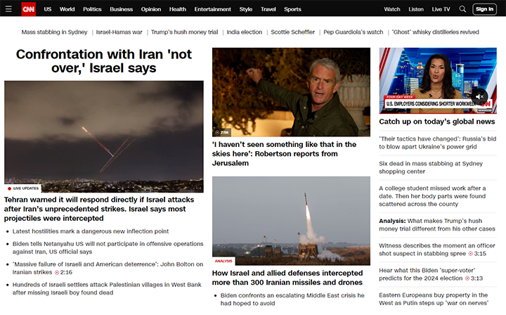 На главной странице сайта американской медиакорпорация CNN, к примеру, было опубликовано сразу несколько статей, посвящённых ночному ракетному удару, ни в одном из заголовков не упоминается, что он был ответным. Читателям сообщали, что конфликт Израиля с Ираном не исчерпан и следует ждать ответа.
