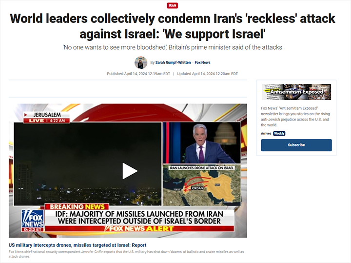 "Мировые лидеры осуждают "безрассудную" атаку Ирана на Израиль: "Мы поддерживаем Израиль"// Скриншот страницы сайта foxnews.com