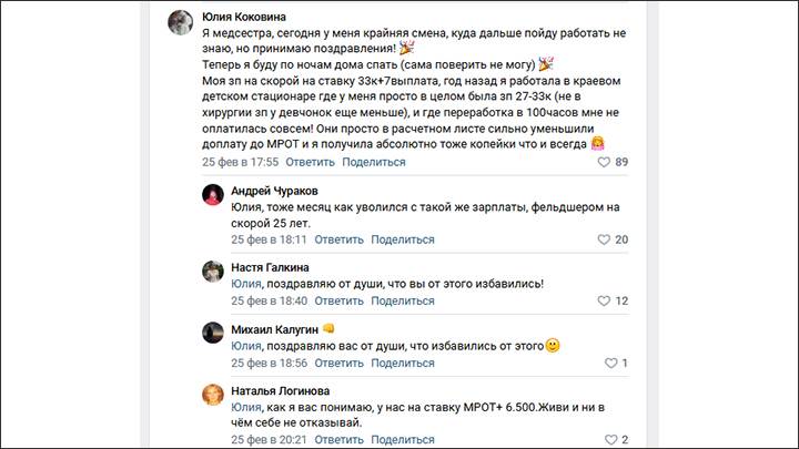 Медики поздравляют друг друга с увольнением//Скриншот комментариев из ВК-сообщества "Медицинская Россия"