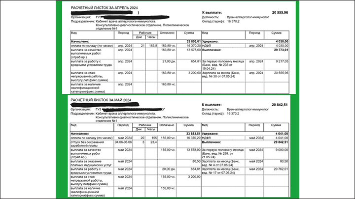 Чтобы не быть голословными, медики показывают расчётные листки. Врач аллерголог-иммунолог в одном из регионов получала на руки в апреле и мае прошлого года чуть менее 30 тысяч рублей в месяц (это одна ставка), а потом просто уволилась. Прочитав о средней зарплате в 123 тысячи, врач сильно удивилась.