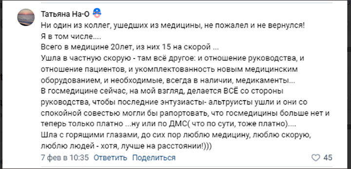Об уходе из медицины мало кто жалеет//Скриншот комментария из ВК-сообщества "Подслушано у медиков"