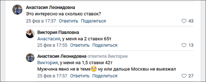 - У меня 1,5 ставки — 42 тысячи рублей. Мужчина явно не в теме. Ну или дальше Москвы не выезжал.