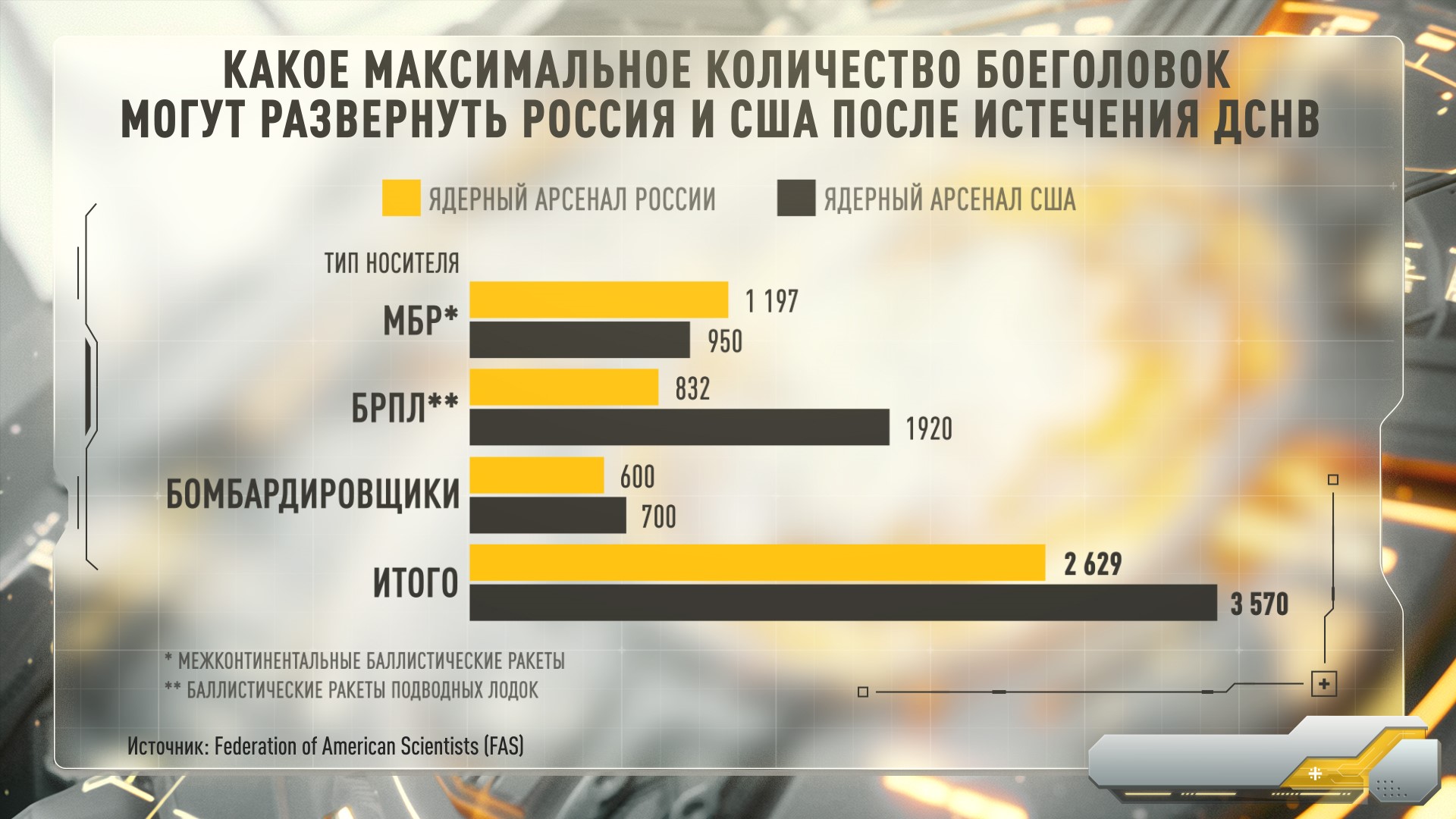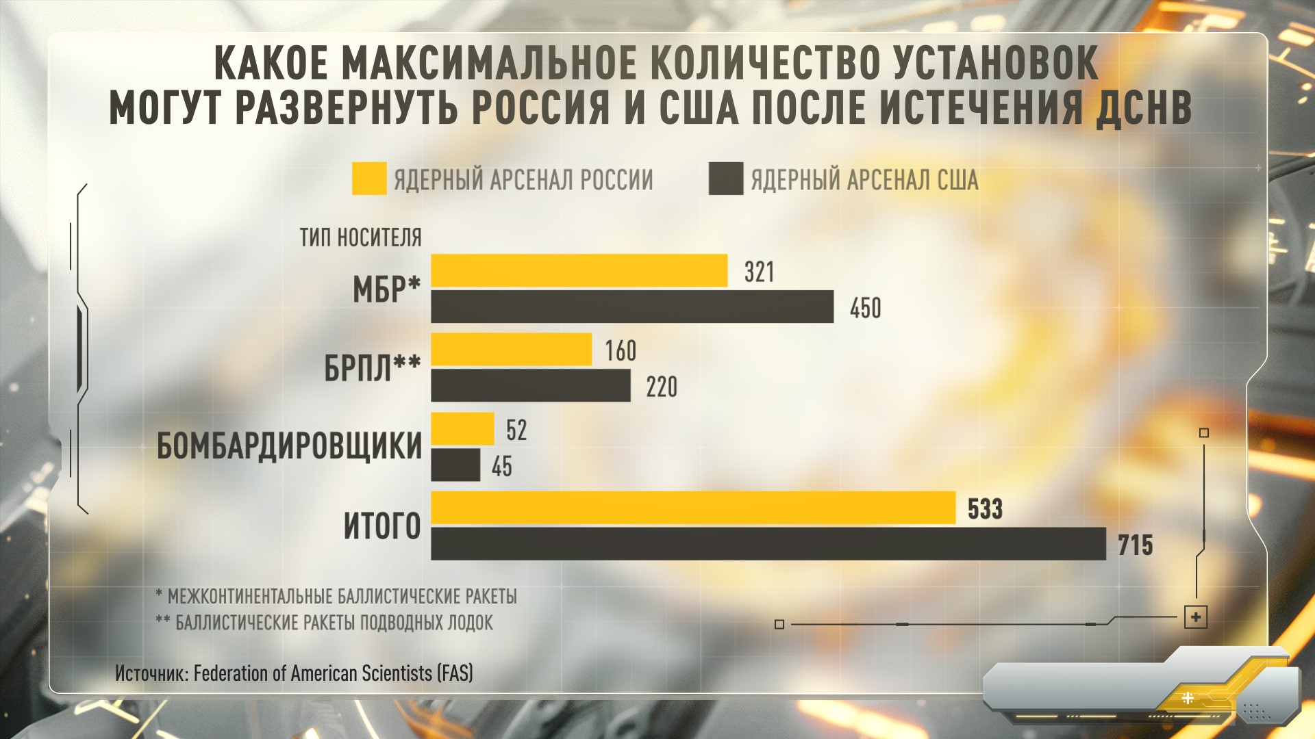 Чтобы наглядно показать, против чего на самом деле стоит Россия, сравним ключевые компоненты. По развёрнутым стратегическим боезарядам, которые ограничивались СНВ-III, наш потенциал составляет более 1550 единиц. США также заявляли о 1550, у Великобритании порядка 200, а у Франции около 280. То есть в целом по блоку НАТО ядерный арсенал уже превышал ограничения для России даже при почившем договоре.