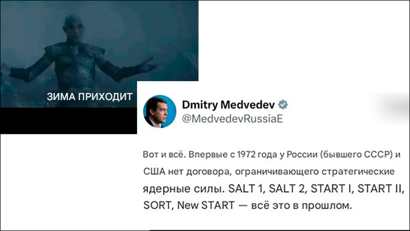 Но главная причина в другом. Запад стремится полностью демонтировать любые симметричные отношения с Россией, чтобы затем попытаться поставить её на колени через неограниченную гонку вооружений. Но отказ от договоров вовсе не путь к "лучшей сделке", а прямая дорога к хаосу. Что подтверждает и свежий пост зампреда Совбеза России Дмитрия Медведева с красноречивой надписью "Зима близко":