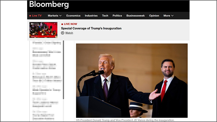 Президент США Дональд Трамп и вице-президент Джей Ди Вэнс во время инаугурации. Скриншот: Bloomberg.