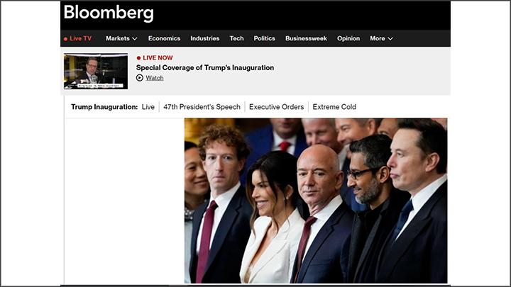Сильные мира сего — Марк Цукерберг, Джефф Безос, Сундар Пичаи и Илон Маск во время инаугурации в ротонде Капитолия. Скриншот: Bloomberg.