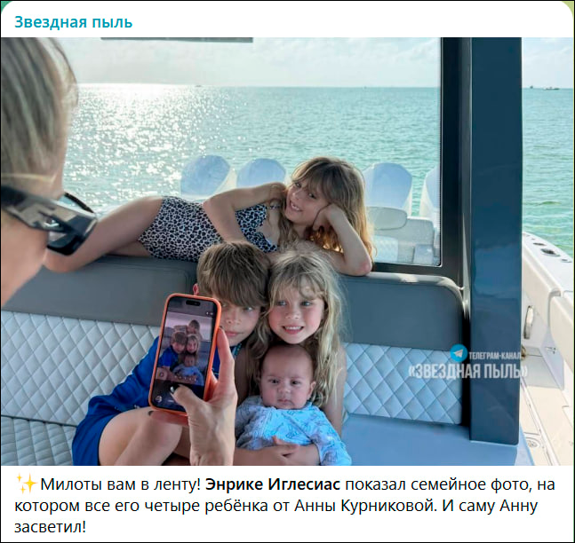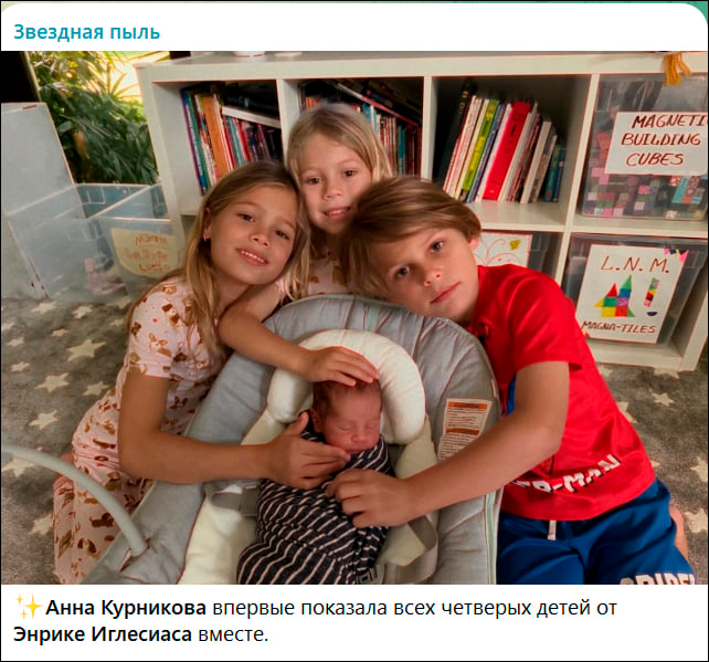 В декабре прошлого года Анна Курникова родила четвёртого ребёнка – от певца Энрике Иглесиаса. Мальчика назвали Ромео. У пары уже есть трое детей: восьмилетние Люси и Николас, а также шестилетняя Мари.