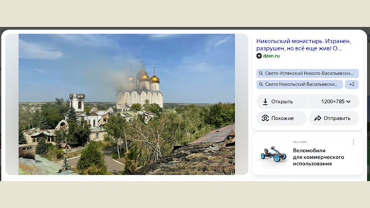 Теперь монастырь почти разрушен, ВСУ стреляют по храму. Скрин с дзен-канала "О жизни, о любви, и о войне"