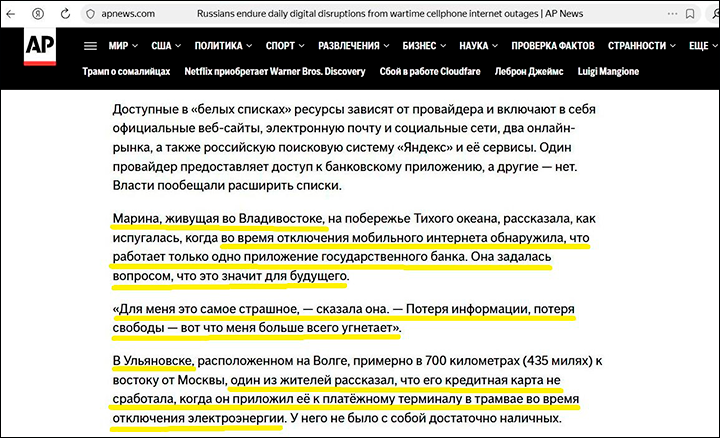 Некая "женщина из Воронежа" жалуется американским журналистам, что на день осталась без мобильного интернета – и "почувствовала себя словно в пещере". А потом Марину (без фамилии) из Владивостока жутко напугало – что бы вы думали? – то, что в какой-то момент доступно было лишь мобильное приложение государственного банка.