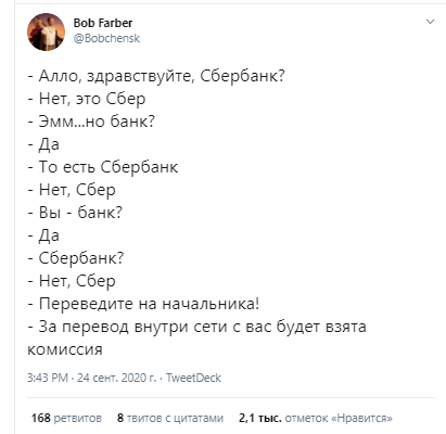 "Это банк Сбер? – Да. – Скажите, чем вы отличаетесь от Сбербанка? – Ничем, такое же г***!"