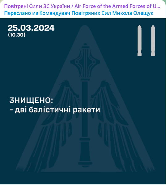 Около 10:30 противник нанёс удар по Киеву двумя баллистическими ракетами с временно оккупированного Крыма. Уничтожены 2 баллистические ракеты. Тип устанавливается,