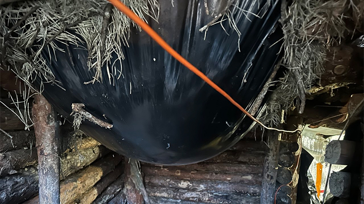Ещё один фронтовой прикол. Сброшенная мина продавила крышу блиндажа. Фото предоставлено Виталием Басовым