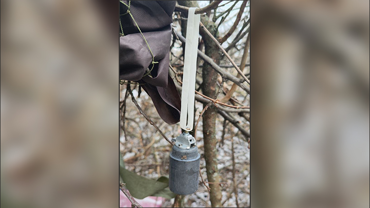 Вот так выглядит висящая на дереве "лампочка" от кассетного боеприпаса. Фото предоставлено Виталием Басовым