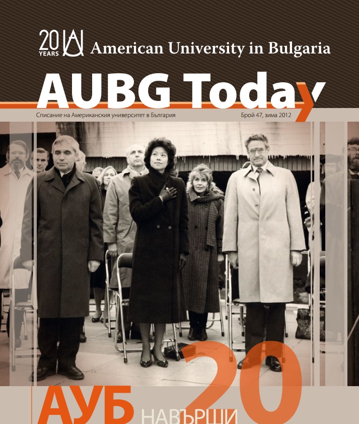 Обложка журнала Американского университета в Болгарии AUBG Today,№47, 2012. . Слева направо: президент Болгарии Желю Желев, спецпосланник Джорджа Буша-ст Эйлин Чу, глава "Открытого общества" Джордж Сорос, фото 1991 года.