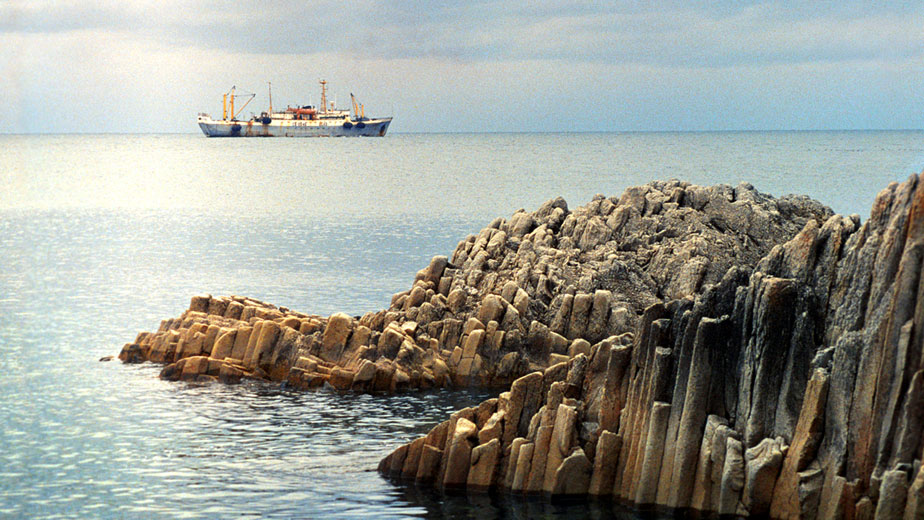 Сахалинская область. Мыс Столбчатый на острове Кунашир Большой Курильской гряды. На втором плане - транспортное судно. Фото Сергея Кривошеева /ИТАР-ТАСС/