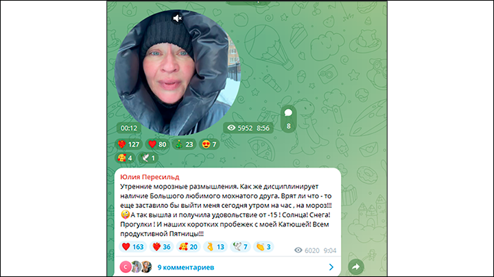 Юлия Пересильд тоже не боится холодов и начинает свой день на свежем воздухе. Актриса регулярно выходит на прогулку со своей любимой собакой и записывает для подписчиков бодрые видеоприветы. Юлия признаётся, что именно этот большой мохнатый друг – её главный мотиватор. Если бы не необходимость выгуливать питомца, вряд ли она решилась бы добровольно провести целый час на 15-градусном морозе.