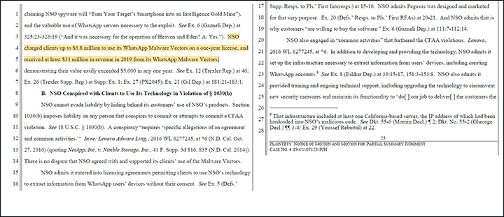 Страница из решения Федерального суда Северного округа Калифорнии, где говорится об активной роли NSO во время кибератак. Источник: База судебных решений США