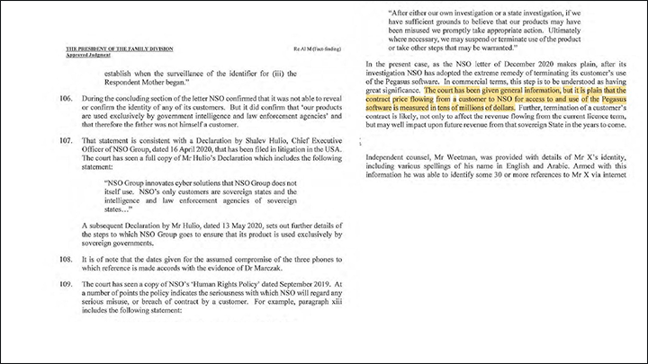 В мае 2021 года Высокий суд Лондона вынес решение по делу о разводе и споре об опеке над детьми между премьер-министром Дубая шейхом Мохаммедом ибн Рашидом и его женой, принцессой Хайей бинт аль-Хусейн. Принцесса дело выиграла. Среди прочего она утверждала, что шейх использовал ресурсы Pegasus для слежки за ней. Суд это подтвердил и в своём решении даже указал:
