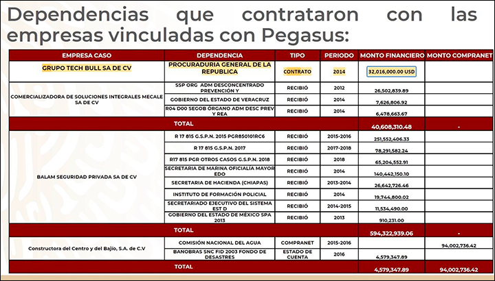 Из отчёта Управления финансовой разведки (UIF) Мексики от 2021 года следует, что генпрокуратура этой страны приобрела полную годовую лицензию на программное обеспечение Pegasus за 32 млн долларов. Продажа была осуществлена через подставную "компанию-однодневку" Grupo Tech Bull.
