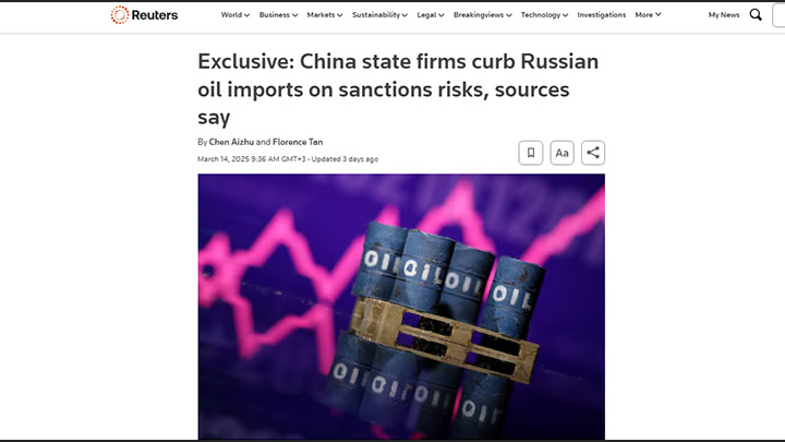 Reuters: Китайские государственные нефтяные компании в этом месяце отказываются от российской нефти, решив соблюдать санкции США против Москвы. Скриншот страницы сайта издания