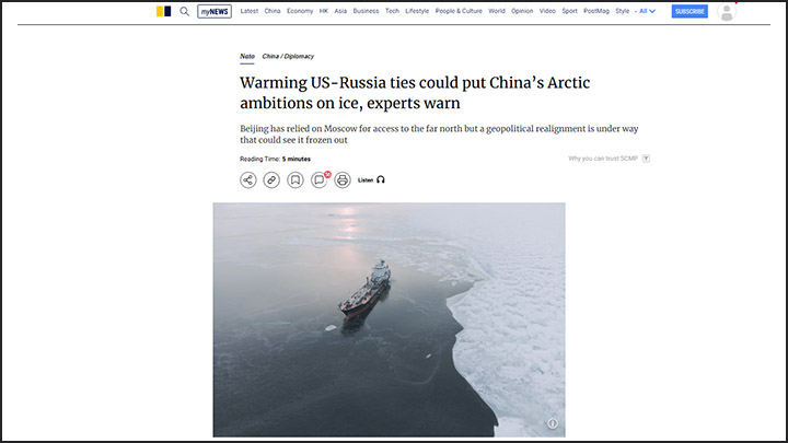 Потепление отношений между США и Россией может заморозить арктические амбиции Китая. Пекин рассчитывал на Москву в плане доступа к Крайнему Северу, но в настоящее время происходит геополитическая перестройка, которая может привести к его замораживанию,