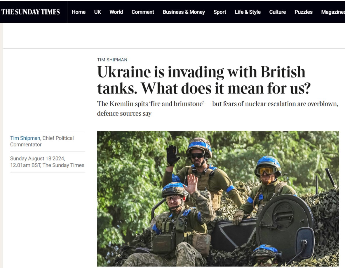 — подчёркивает воскресное издание The Times в статье с характерным заголовком "Украина вторгается с британскими танками. Что это значит для нас?".