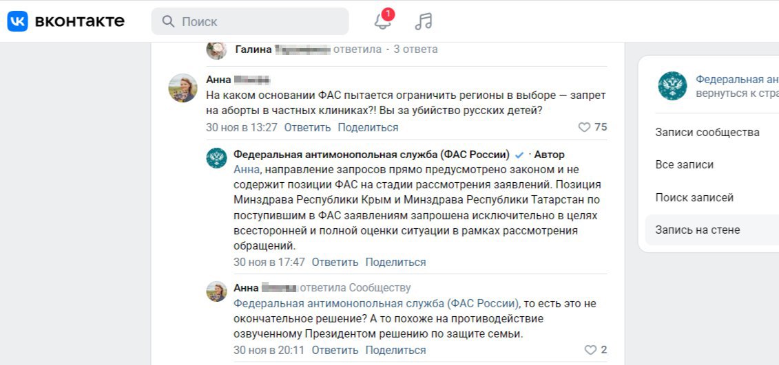 Ann S.: "На каком основании ФАС требует вернуть проведение абортов в частные клиники? Только сознательные политики стали поддерживать граждан и исполнять чётко поставленную задачу нашего президента по поддержке повышения рождаемости и выводить абортный бизнес из тени, под четкий контроль государства и российского законодательства, как ФАС вместо поддержки этого, начало давить на Крым и Татарстан. Вы на кого работаете? На врагов? Вы чьи денежные интересы отстаиваете? Аборты не только нужно выводить из частного бизнеса, говорю как многодетная мать и гинеколог, ещё и из ОМС выводить, и так будет?"