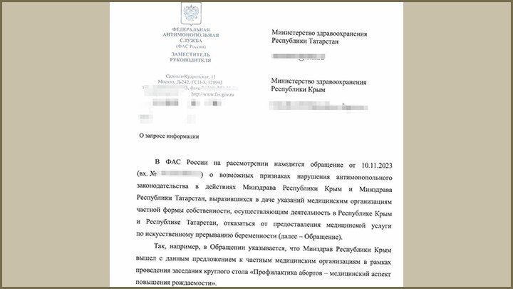 В тексте письма в адрес обоих региональных минздравов указывается, что эти самые "возможные признаки" выразились в "даче указаний медицинским организациям с частной формой собственности, осуществляющим деятельность в Республике Крым и Республике Татарстан, отказаться от предоставления услуги по искусственному прерыванию беременности".