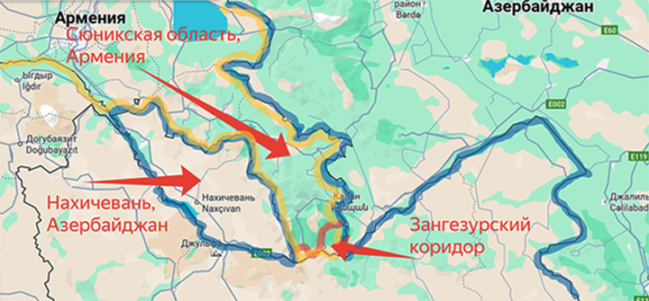 Зангезурский коридор соединяет основную территорию Азербайджана с эксклавом Нахичевань (границы голубого цвета) через Сюникскую область Армении (границы жёлтым цветом). Инфографика: Царьград