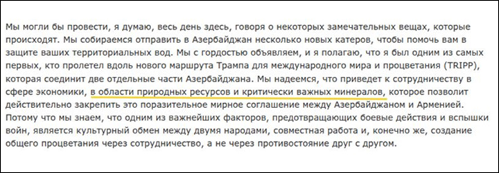И, надо сказать, Баку следует этому курсу чётко. Ещё недавно этот проект разрабатывали с безусловным участием России, но теперь об этом речи уже не идёт. Летом прошлого года в США при прямом участии президента США было подписано соглашение между Азербайджаном и Арменией, который не столько про окончание их междоусобной войны, сколько про то, что Штаты фактически выкупили Кавказ. А Зангезурский коридор официально стал "Маршрутом Трампа ради международного мира и процветания" (TRIPP).