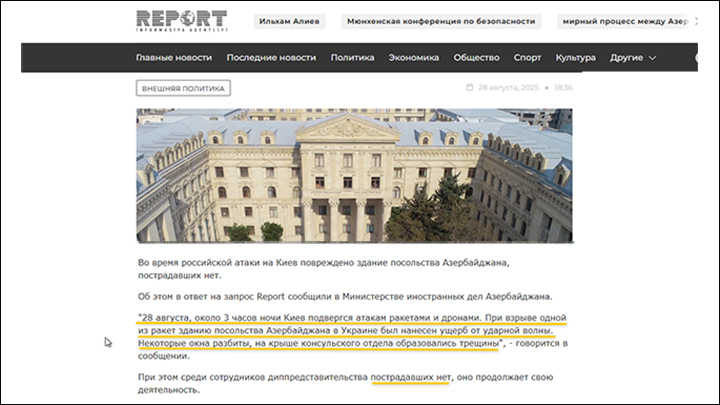 Азербайджанский МИД утверждает, что 2 января 2024 года в результате нашего воздушного удара ракетой "Кинжал" примерно в 35 шагах от здания посольства республики в Киеве образовался кратер диаметром около трёх метров, а на глубине восемь метров от поверхности земли был обнаружен неразорвавшийся боеприпас.