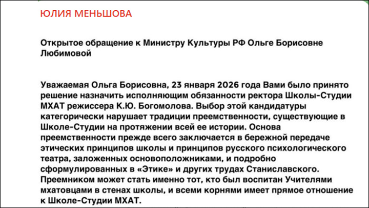 Выпускники Школы-студии выступили категорически против этого кадрового решения. Открытое письмо с криком о помощи на имя министра культуры Ольги Любимовой опубликовано в социальных сетях актёра Александра Поршина и очень быстро разошлось в мессенджерах.
