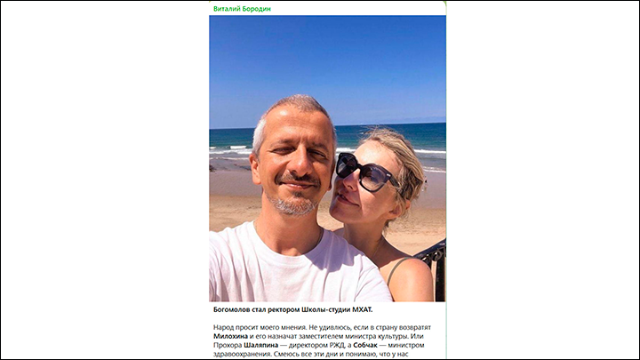 Есть те, кто считает, что устроиться на третью престижную работу Богомолову помогла протекция его жены – Ксении Собчак. Скриншот ТГ-канала "Виталий Бородин"