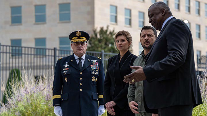 Что говорил экс-глава американского Генштаба Марк Милли на этой встрече, нам неизвестно. Но в беседе с Залужным он рассмеялся в ответ на просьбу передать Украине F-16. На фото (слева направо): Марк Милли, Алёна и Владимир Зеленские, глава Пентагона Ллойд Остин. Tsgt. Jack Sanders/Dod/Global Look Press