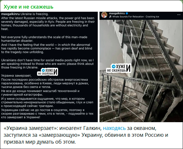 Пост беглого комика про замерзающую Украину был сделан на английском языке и сопровождался фотографией, демонстрирующей подъезд жилого дома, полностью покрытый толстым слоем льда. Этот визуальный ряд должен был, по замыслу шоумена, служить неопровержимым доказательством гуманитарной катастрофы.