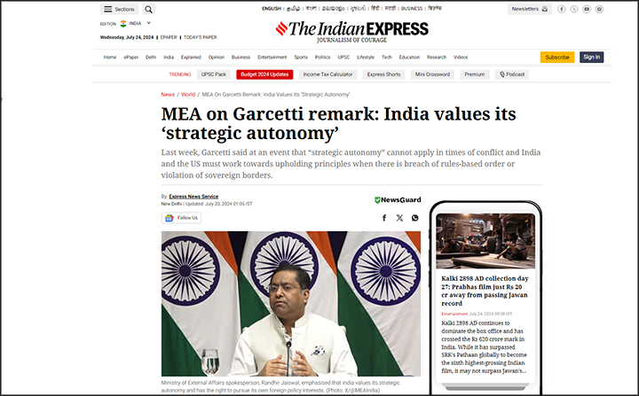 Официальный представитель индийского МИД Рандхир Джайсвал: Индия имеет собственное мнение относительно своей стратегической автономии и может не соглашаться с США. Скриншот страницы сайта The Indian Express