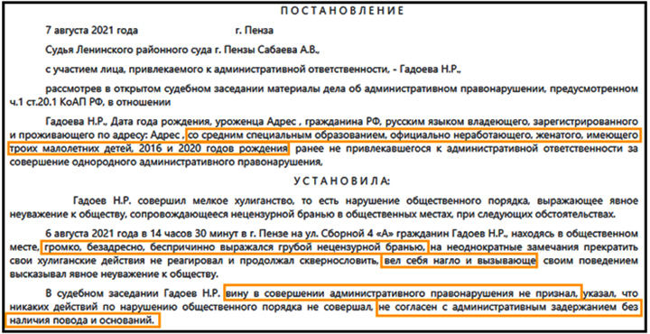 С Гадоевым они знакомы более 10 лет. У обеих есть от него дети, рождённые в 2020 году с разницей всего в месяц. Горожане не раз видели семейство на совместных прогулках. Одна из них – его официальная жена. Свидетельство о том, что Гадоев в браке, есть в постановлении Ленинского суда города Пензы. Да, уроженец Таджикистана в августе 2021 года привлекался к административной ответственности за хулиганство – громко ругался матом на улице. Кстати, рапорт на него составлял сотрудник ФСБ.
