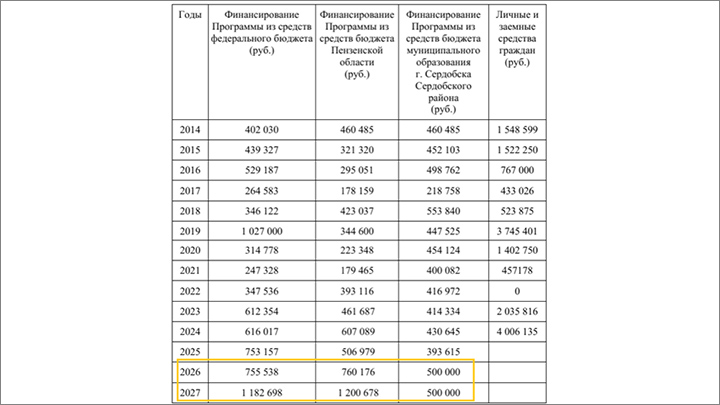 Объём финансирования программы с 2014 года. В 2022 году получатели субсидии были многодетные, поэтому ничего не платили. Скриншот документа с сайта gorod-serdobsk.ru