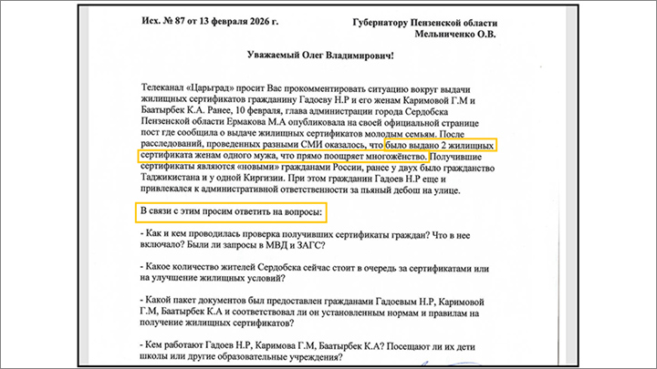 Царьград направил запросы губернатору Пензенской области и в администрацию Сердобска. Призываем наших читателей делать то же самое, если вы видите малейшую несправедливость при раздаче жилищных сертификатов. Скорее всего, это не единичный случай. Разбираться нужно предметно, чтобы у чиновников не было иллюзии, будто им всё сойдёт с рук. Не сойдёт. Образец обращения для неравнодушных граждан можно найти по ссылке.