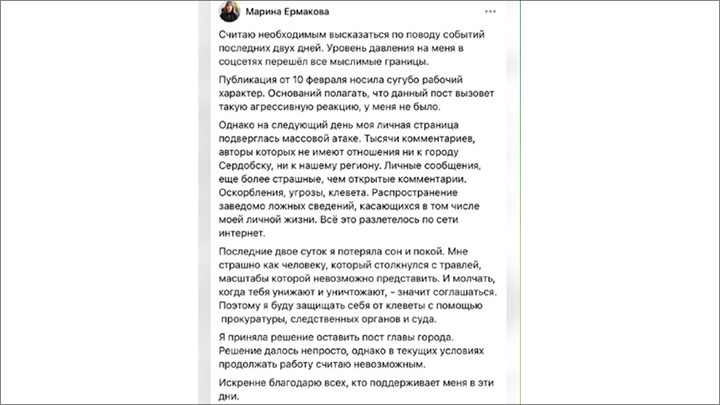 Сама Марина Ермакова через два дня после судьбоносного поста объявила, что уходит в отставку. Говорит, из-за беспрецедентной травли. Грозит судами за клевету.