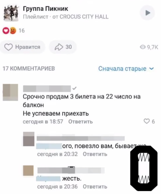 Всего в этот злополучный вечер в «Крокусе» должны были собраться 7200 человек, то есть полный зал. Все билеты были уже проданы, однако буквально за час до начала концерта в интернете появилось объявление от жителя Владимирской области, который пытался продать билеты на выступление «Пикника». Вечером 22 марта 25-летний Кирилл ехал с родными на концерт, но попал в пробку, которая в итоге спасла им жизнь.
