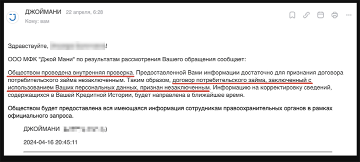 Скриншот письма от МФО "Джой мани" // документ предоставлен собеседницей Царьграда