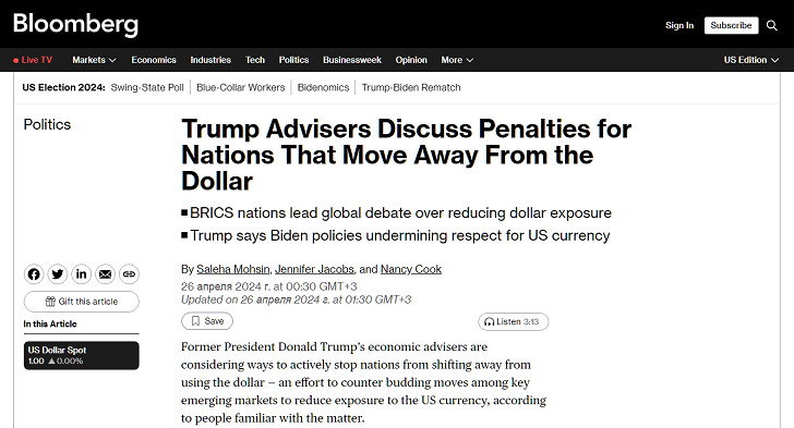 Советники Трампа обсуждают санкции для стран, которые отходят от доллара / Скрин с сайта bloomberg.com