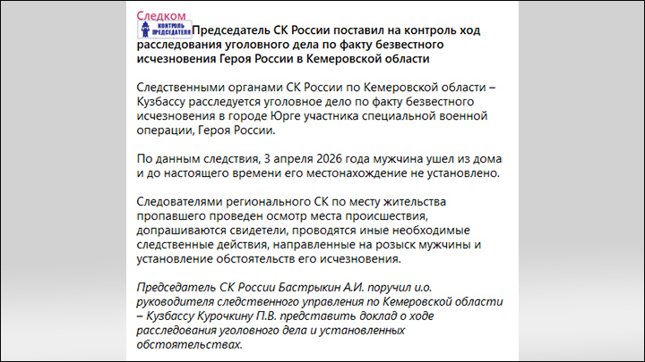 Дело о пропаже Героя России на личном контроле у главы СК. Скриншот с ТГ-канала "Следком"
