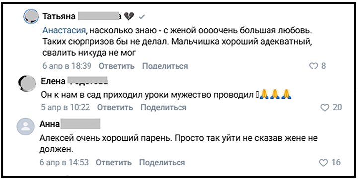 У Алексея есть мать и сестра, они тоже живут в Юрге, но и они ничего не знают. Как сквозь землю провалился. По словам Валерии, у мужа были с собой документы и один из его телефонов, а второй он оставил дома. Но никаких зацепок в нём найти не удалось. К поискам подключилась полиция, по региону распространили ориентировки с фото пропавшего Героя, результатов нет – никто его не видел.