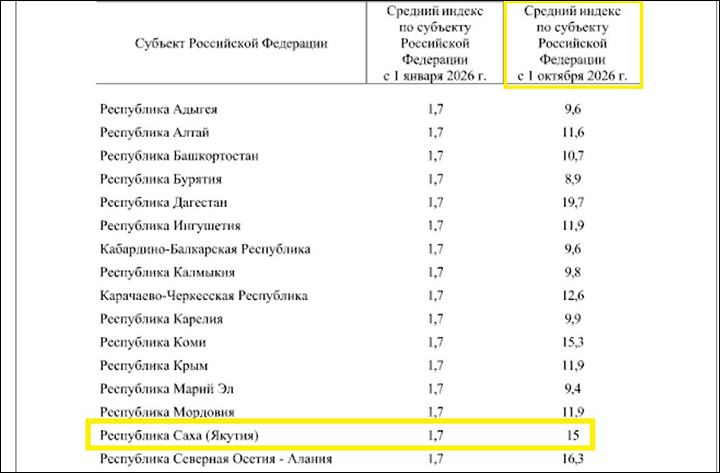 Согласно изданному в ноябре распоряжению правительства, с 1 октября 2026 года тарифы для граждан вырастут ещё примерно на 10% – и составят в Якутии вместо нынешних 9 рублей 66 копеек за киловатт – 10 рублей 71 копейку.