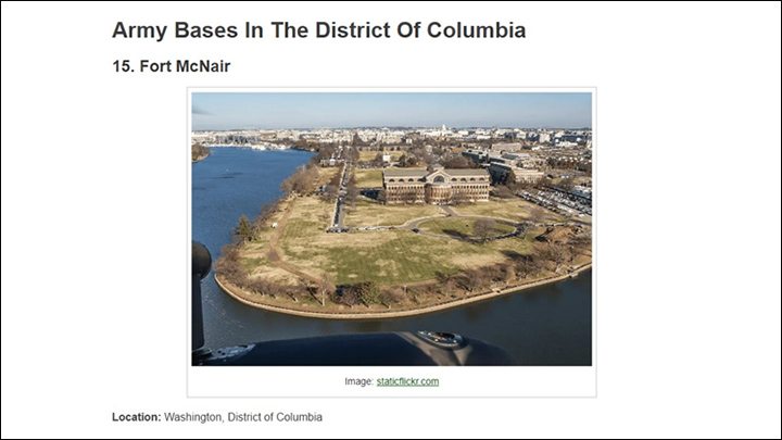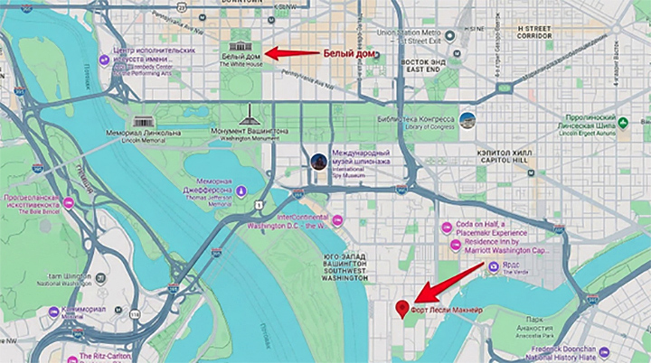 Ещё ближе к форту расположено здание Капитолия. Во время событий 6 января 2021 года, когда сторонники Трампа в рогатых шлемах захватили здание Конгресса, именно в "Лесли Макнейр" эвакуировали конгрессменов, причём всех разом: и республиканцев, и демократов.